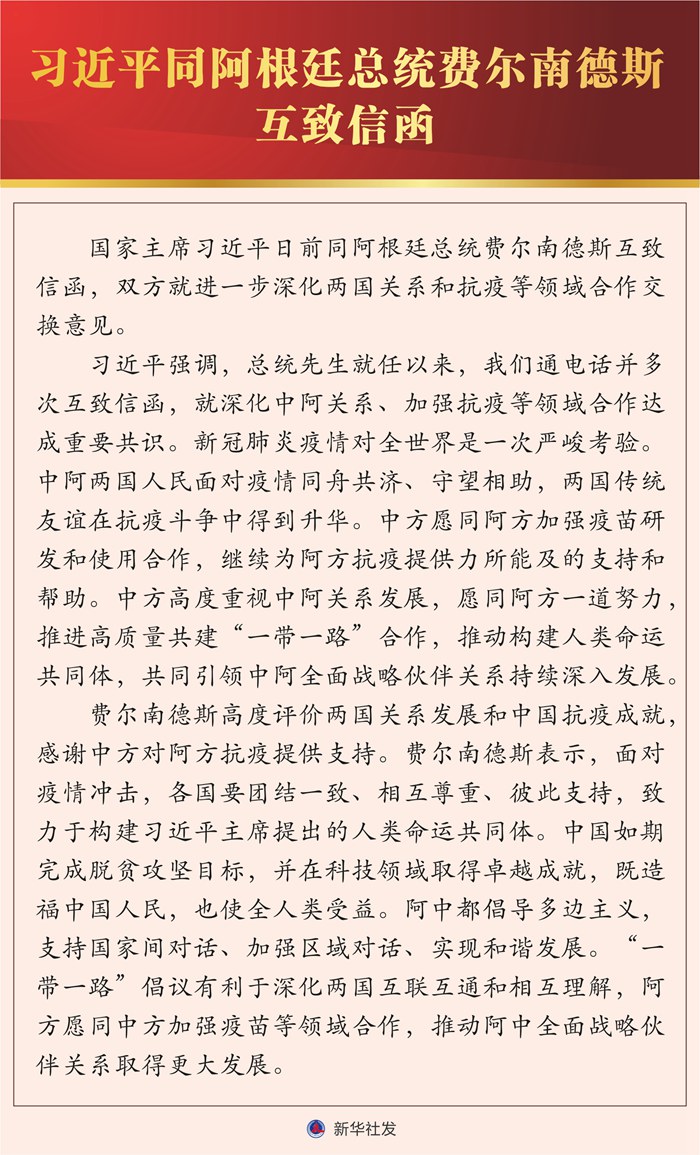 新华社北京1月4日电 国家主席习近平日前同阿根廷总统费尔南德斯互致信函,双方就进一步深化两国关系和抗疫等领域合作交换意见。