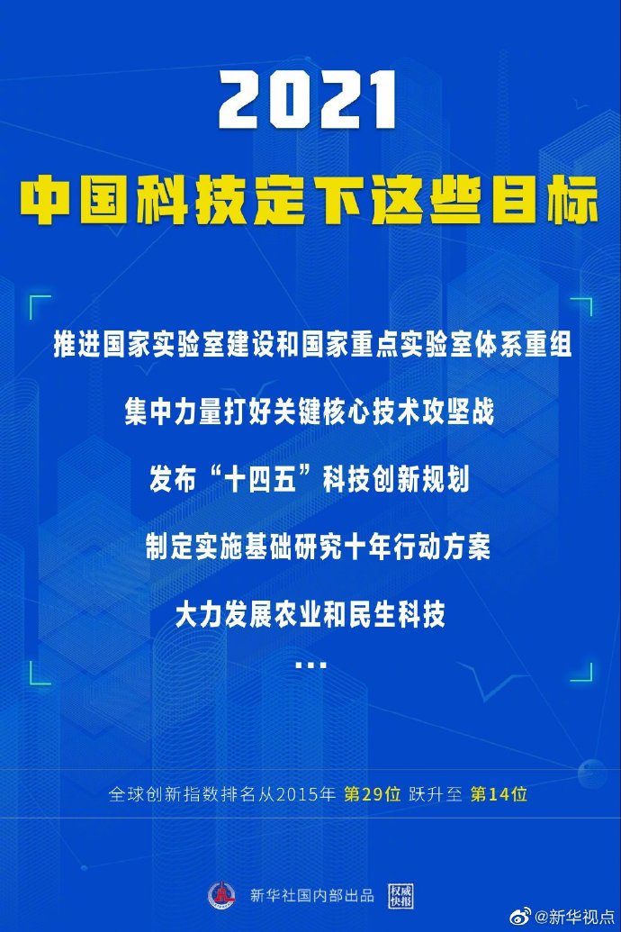 1月5日在京召开的2021年全国科技工作会议上,提出了中国科技2021年目标,包括推进国家实验室建设和国家重点实验室体系重组、集中力量打好关键核心技术攻坚战等。面向“十四五”,将紧紧围绕构建新发展格局发挥科技创新的战略支撑作用。经过五年努力,我国科技事业加速发展,创新体系更健全创新环境不断优化,创新能力显著增强。(记者陈芳、胡喆)