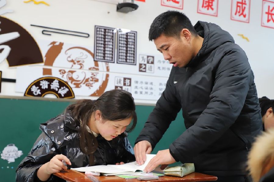 王忠雷在北红小学教室里为学生们辅导功课。新华社记者孙晓宇 摄