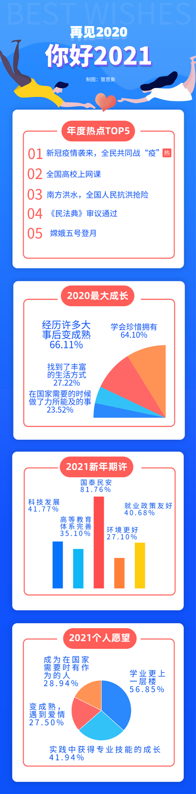 中青校媒调查发现,关于“2020年,你认为自己最大的成长是什么”这一问题,受访者中66.11%认为自己经历许多大事后变得成熟,64.10%表示自己学会珍惜拥有,27.22%表示找到了更丰富的生活方式,23.52%表示自己在国家需要时做了力所能及的事情。此外,实践中获得专业技能、拥有更加丰富的人际圈、学业进步、找到爱情,以及找到理想的工作等都是这届年轻人2020年的成长关键词。