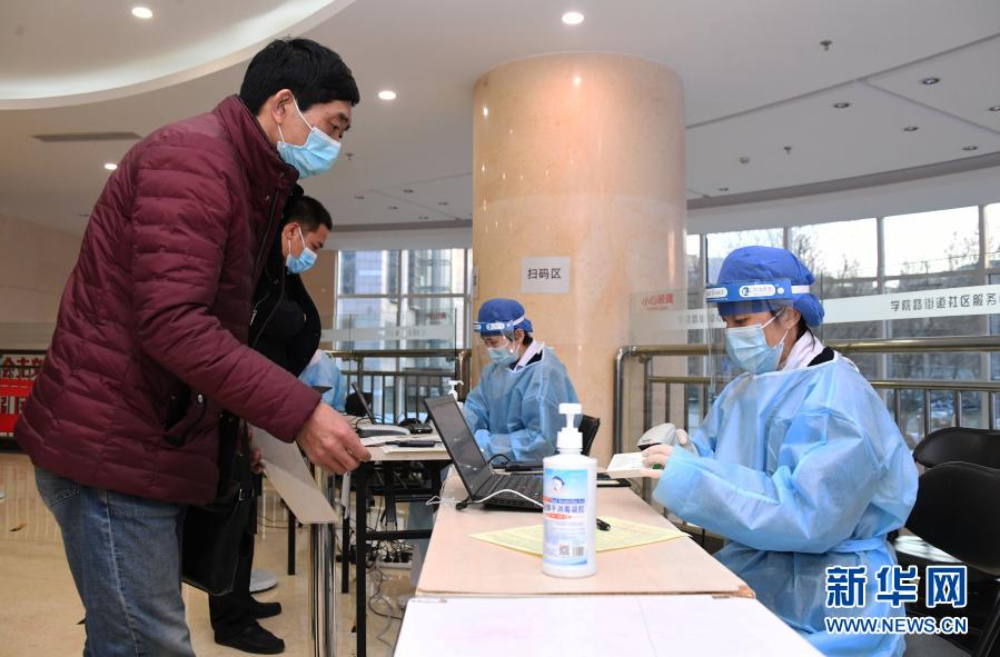 1月11日,在北京市海淀区学院路街道的一处临时新冠疫苗接种点,医务人员(前右)扫描新冠疫苗电子监管码,准备接种工作。新华社记者 任超 摄