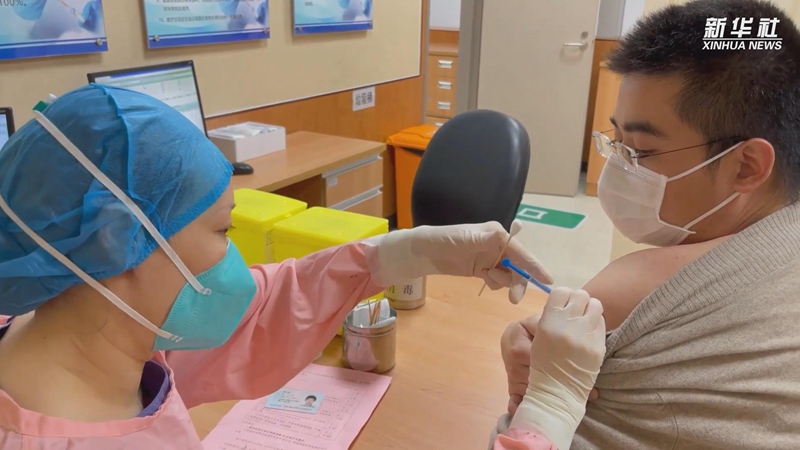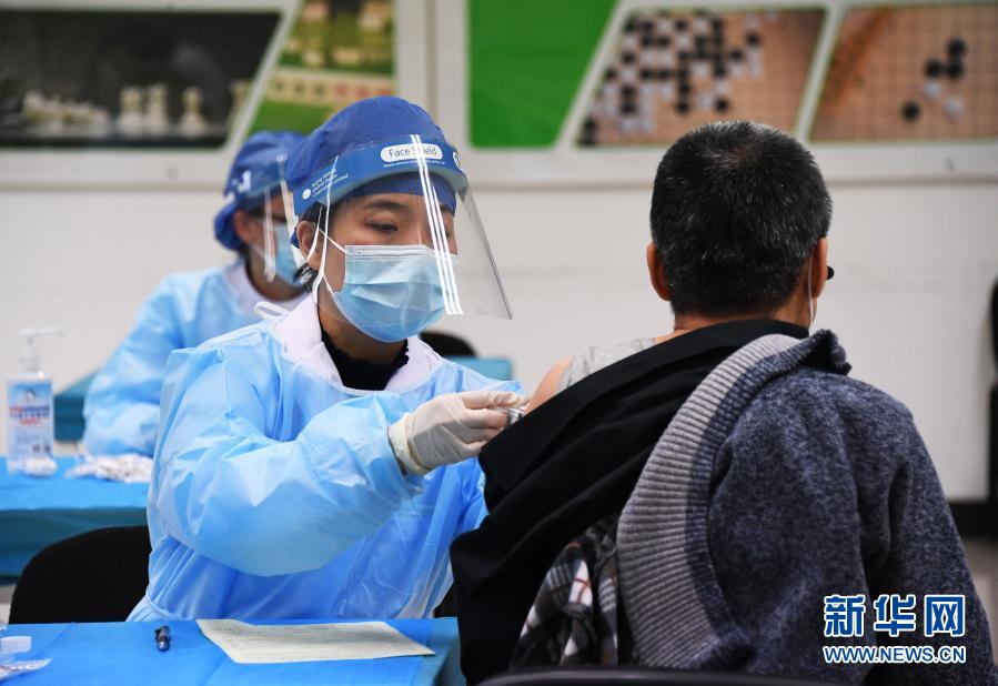 1月11日,在北京市海淀区学院路街道的一处临时新冠疫苗接种点,医务人员为接种人员接种新冠疫苗。新华社记者 任超 摄