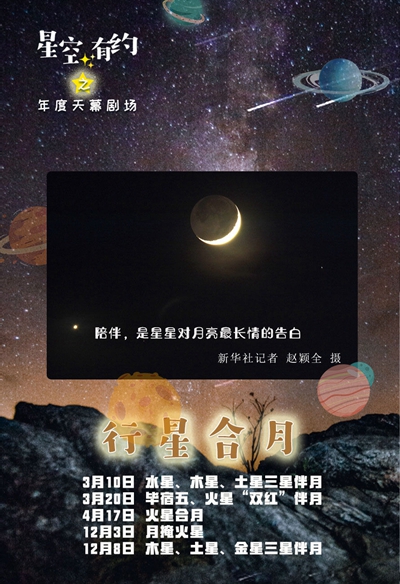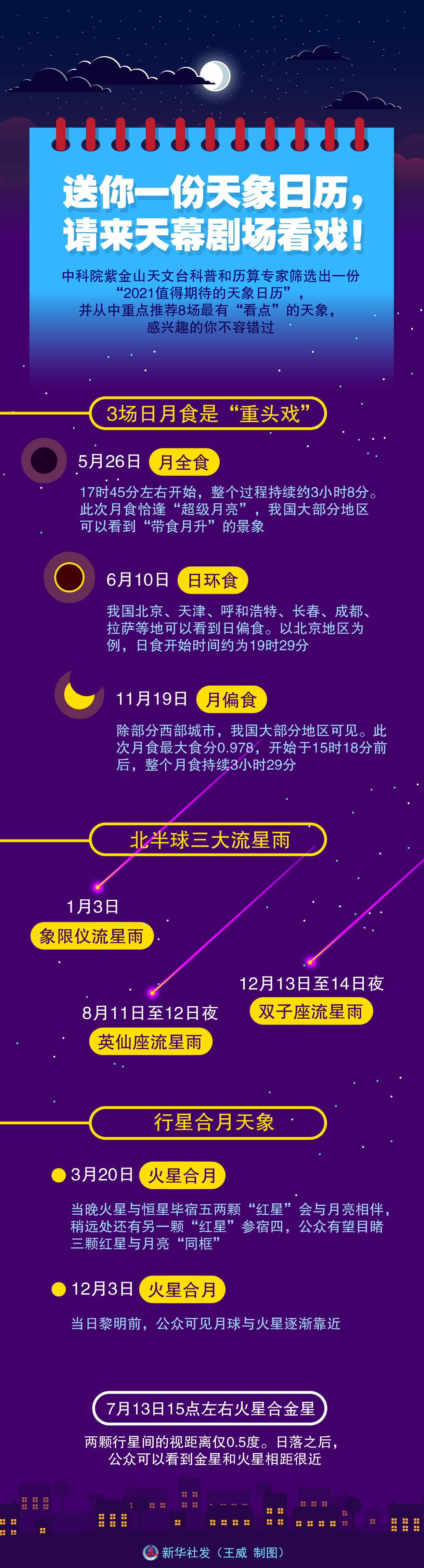 新华社南京1月14日电(记者王珏玢)2021年“天幕大戏”精彩纷呈,流星雨、行星合月、超级月亮、日月食等轮番上演。中科院紫金山天文台科普和历算专家筛选出一份“2021值得期待的天象日历”,并从中重点推荐8场最有“看点”的天象,感兴趣的你不容错过。