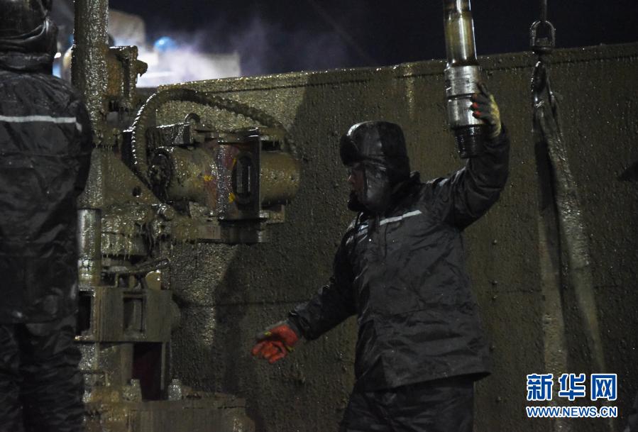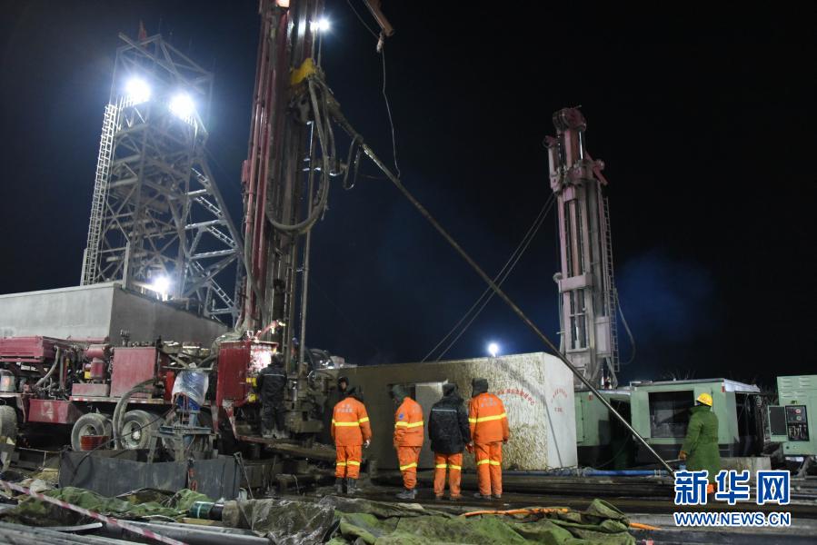 1月18日凌晨,救援人员正在全力打通1号钻孔。新华社记者王凯摄