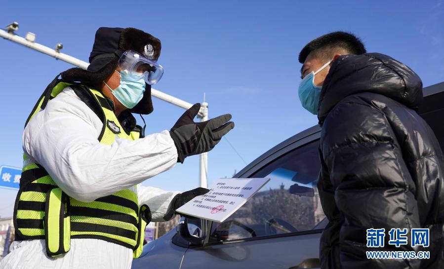 在通化市高速公路口,执勤交警对出城车辆人员进行检查登记(1月18日摄)。新华社记者 许畅 摄