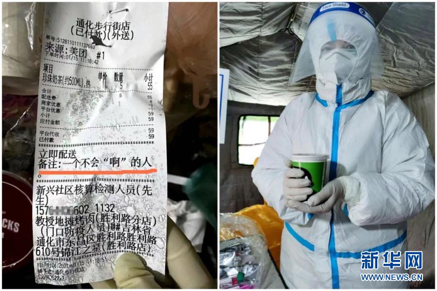 这是一张拼版照片,左图为:通化市中心医院营养科技师葛馨在核酸采集点收到的奶茶外卖配送单,备注中匿名购买者留言“一个不会‘啊’的人”;右图为:葛馨收到奶茶后的留影(1月15日摄)。新华社发