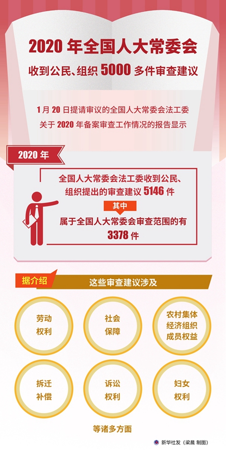 新华社北京1月21日电(记者陈菲、刘硕)20日提请审议的全国人大常委会法工委关于2020年备案审查工作情况的报告显示,2020年,全国人大常委会法工委收到公民、组织提出的审查建议5146件,其中属于全国人大常委会审查范围的有3378件。据介绍,这些审查建议涉及劳动权利、社会保障、农村集体经济组织成员权益、拆迁补偿、诉讼权利、妇女权利等诸多方面。