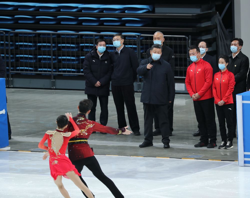 2021年1月18日,习近平在位于北京市海淀区的首都体育馆考察调研,了解运动场馆建设和运动员参赛备战等情况,看望慰问运动员、教练员。新华社记者 姚大伟 摄
