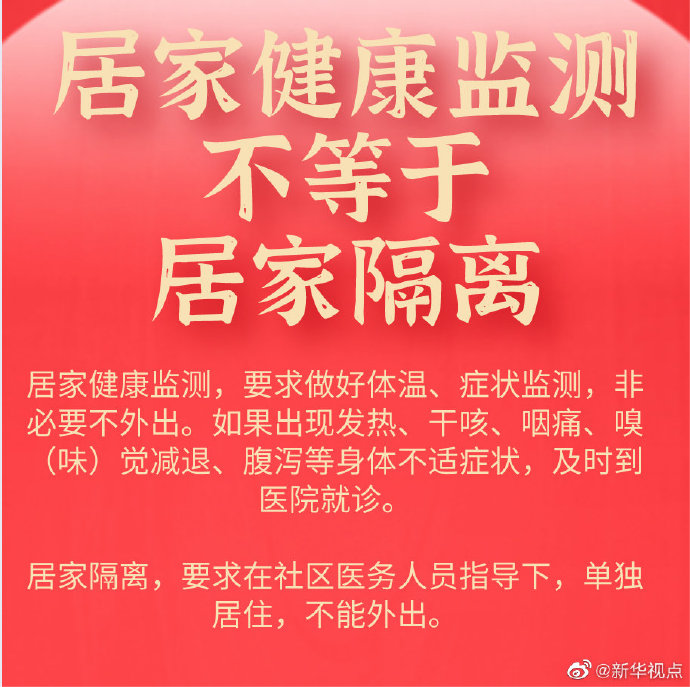 国家卫健委明确区分居家隔离与居家健康监测。居家健康监测,是要做好体温、症状监测,非必要不外出。如果出现发热、干咳、咽痛、嗅(味)觉减退、腹泻等身体不适症状,及时到医院就诊。而居家隔离,是指要求在社区医务人员指导下,单独居住,不能外出。