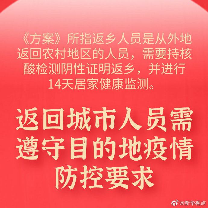方案明确:返乡人员具体指从外地返回农村地区的人员,需持有7天内有效核酸检测阴性证明返乡,并进行14天居家健康监测。国家卫健委提示,返回城市人员需遵守目的地疫情防控要求。