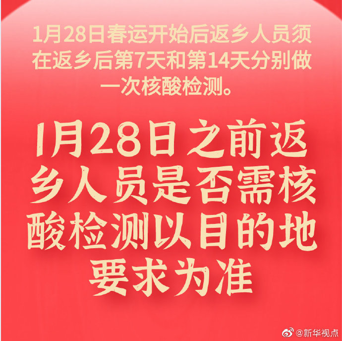 其中,针对返乡后第7天和第14天的核酸检测,1月28日前的返乡人员是否需要完成以目的地要求为准。