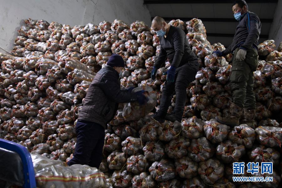 工人在绥化市庆达农产品批发大市场搬运蔬菜(1月20日摄)。新华社发(张涛摄)