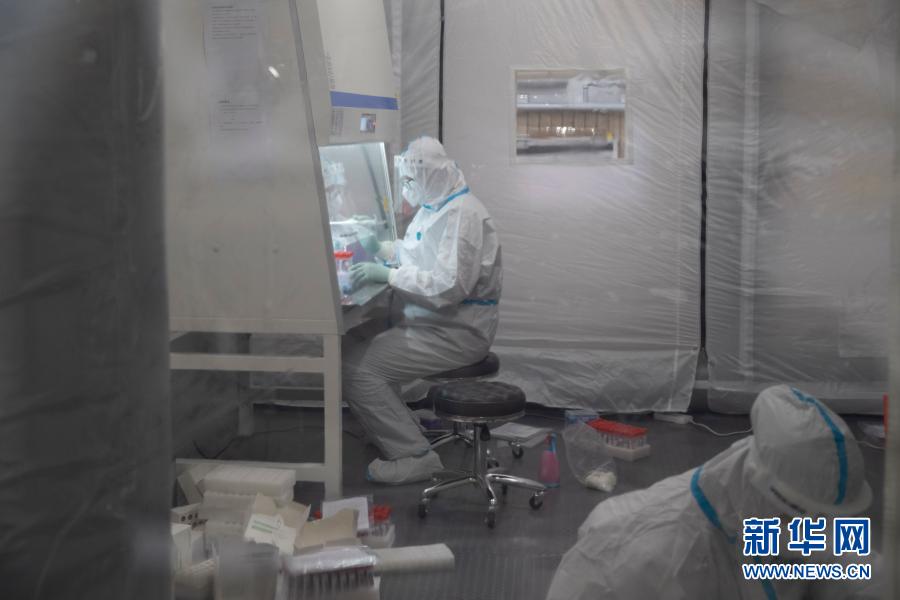 工作人员在望奎县移动方舱检测实验室里工作(1月17日摄)。新华社发(张涛摄)