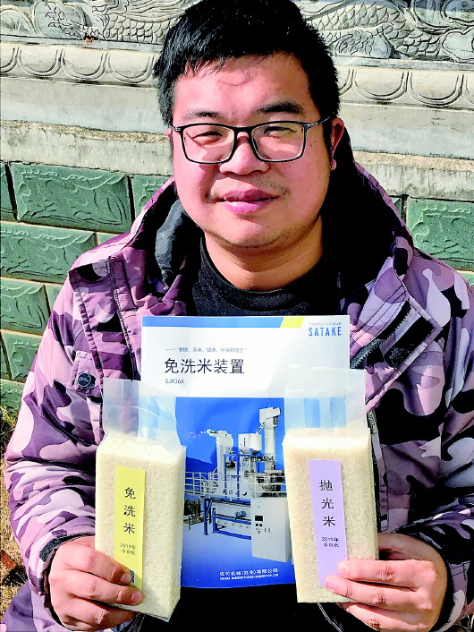 丁旦展示市场上免洗大米产品和生产技术。 记者陈春园摄