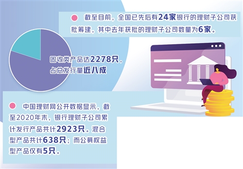 受近来A股上涨行情影响,有关理财子公司布局权益类理财产品的议论声也越来越大。从实际情况看,权益类理财产品占比依然较低。中国理财网公开数据显示,截至2020年末,银行理财子公司累计发行产品共计2923只。其中,固收类产品达2278只,占总发行量近八成;其次是混合型产品,共计638只;而公募权益型产品仅有5只。
