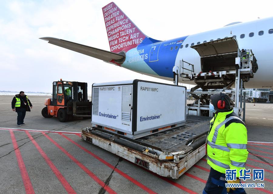 2021年1月16日,在塞尔维亚首都贝尔格莱德,机场工作人员卸载首批由中国国药集团生产的新冠疫苗。新华社发(普雷德拉格·米洛萨夫列维奇摄)