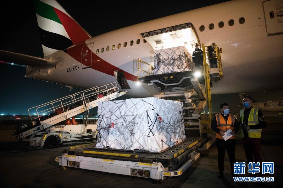 2020年12月10日,在埃及开罗国际机场,工作人员运输中国研制生产的新冠疫苗。新华社记者邬惠我摄