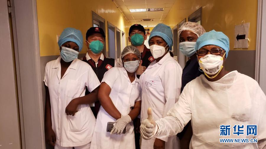 2020年5月26日,中国抗疫医疗专家组在刚果(布)首都布拉柴维尔指导新冠肺炎病房建设时,与当地一线医务人员合影。新华社发