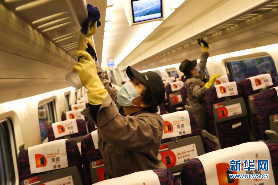 1月27日,在中国铁路兰州局集团有限公司兰州车辆段兰州西动车运用所,保洁人员为列车内部实施消杀。