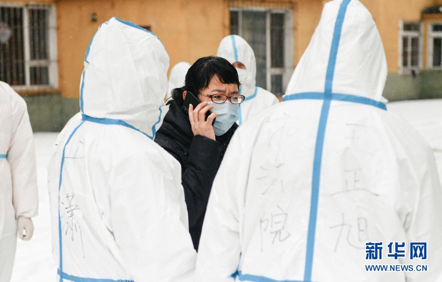 在通化市东昌区老站街道一建社区,社区工作人员与居民联系进行生活用品配送(1月26日摄)。新华社记者 许畅 摄