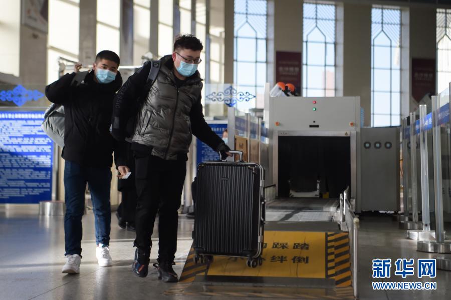 1月28日,在呼和浩特东火车站,旅客通过安检后走向候车大厅。