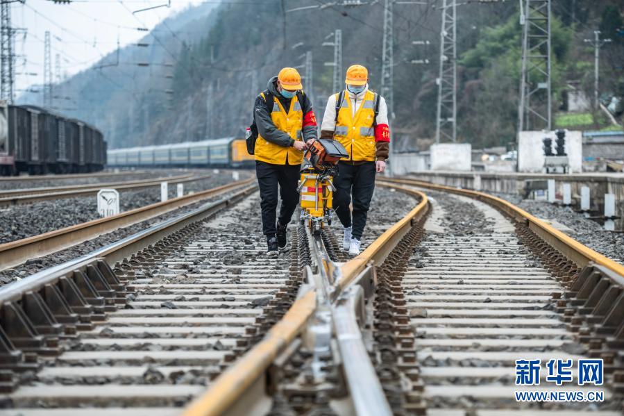 1月28日,中国铁路成都局集团有限公司六盘水工电段探检车间职工在进行钢轨探伤检查。