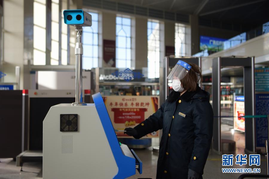 1月28日,在呼和浩特东火车站,工作人员利用红外设备监测进站旅客体温。