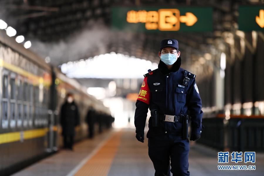 1月28日,在停靠哈尔滨火车站的K7103次列车旁,乘警巡查经过车厢。