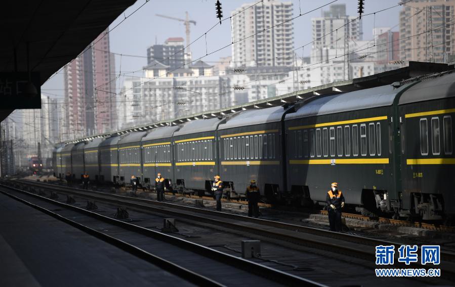 1月28日,铁路工人在西安站对进站的Z274次列车进行检查和加水。