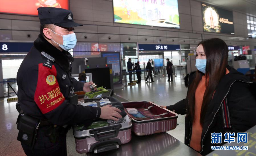 1月28日,上海虹桥火车站派出所民警周强(左)在对一名旅客进行开箱检查。
