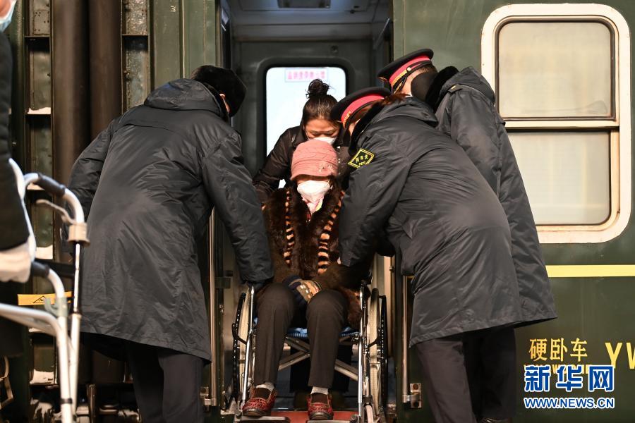 1月28日,在哈尔滨火车站站台,工作人员帮助乘轮椅的老人登上K7103次列车。