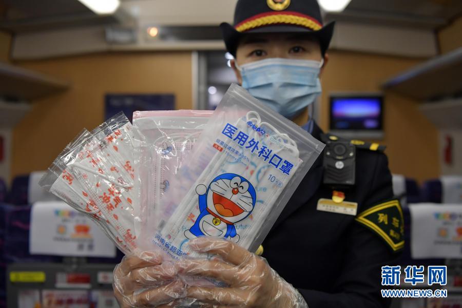 1月28日,在南昌发往婺源的D6264次列车上,乘务员展示为旅客准备的口罩。