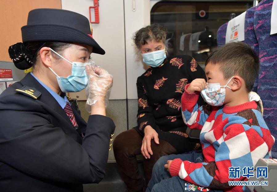 1月28日,在南昌发往婺源的D6264次列车上,乘务员向小旅客示范正确佩戴口罩的方法。