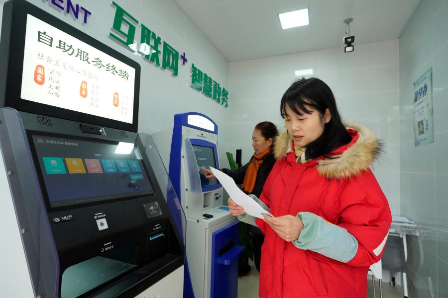 2020年12月22日,在重庆市北碚区蔡家岗街道云台社区24小时政务自助服务厅,居民在查看自助系统打印的婚育证明。新华社发(秦廷富 摄)