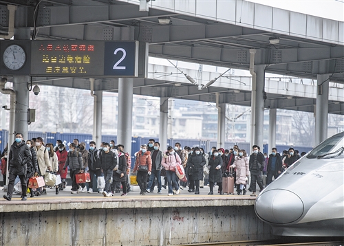 与往年春运首日熙熙攘攘的客流相比,地处沂蒙老区的山东临沂北高铁站今年的候车室略显冷清。受疫情影响,十余趟列车停运,客流较去年同期减少了近六成。在车站进站口,智能红外测温仪正为旅客无接触测温,两名穿蓝马甲的青年志愿者向旅客宣传乘车注意事项,车站还为旅客免费准备了口罩、消毒湿巾等防护用品。