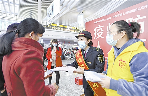 1月28日,铁路宁波站春运首日发送旅客4万人次左右。铁路宁波站部分党团员、青年志愿者组成防疫劝导巡检小组,劝导未佩戴口罩或未正确佩戴口罩的旅客规范佩戴口罩,并提供各种防疫服务。记者 郁进东摄