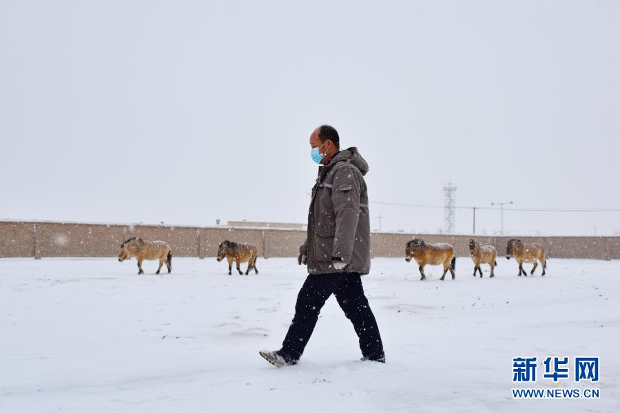 1月23日,饲养员高守勤在新疆吉木萨尔县野马繁殖研究中心巡护野马。新华社记者 高晗 摄