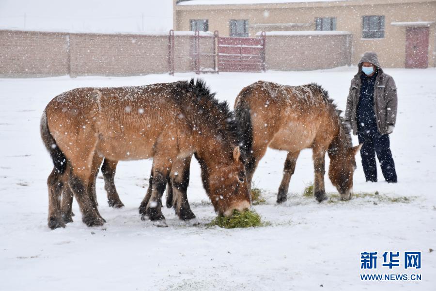 1月23日,在新疆吉木萨尔县野马繁殖研究中心,饲养员高守勤给野马喂食。新华社记者 高晗 摄