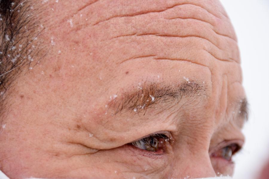 1月23日,刚外出巡护野马不久,饲养员高守勤的眼睫毛和头发都上了霜。新华社记者 高晗 摄