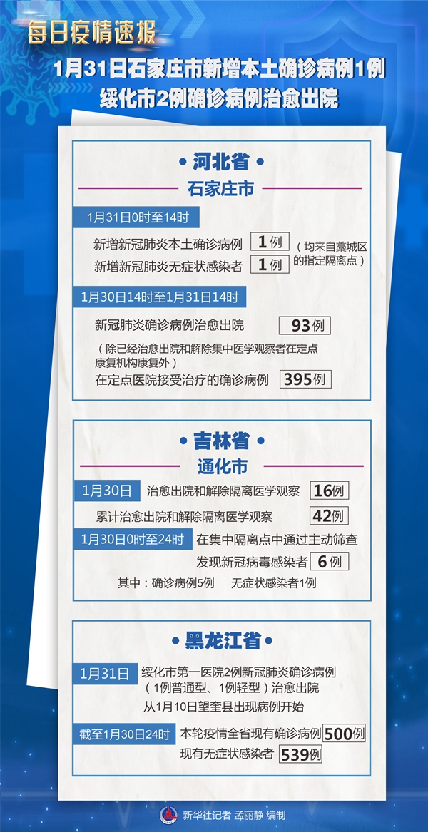 新华社北京1月31日电 1月31日0时至14时,石家庄市新增新冠肺炎本土确诊病例1例、新增新冠肺炎无症状感染者1例,均来自藁城区的指定隔离点;31日在黑龙江省绥化市第一医院,2例新冠肺炎确诊病例(1例普通型、1例轻型)治愈出院。