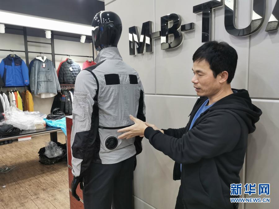 福建省石狮一笔成服饰科技有限公司总经理庄小清展示装有小风扇的工作服(1月27日摄)。新华社记者凡帅帅 摄