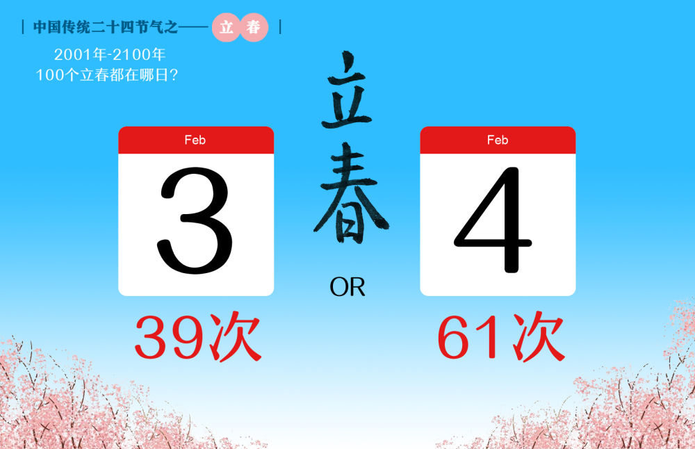 20世纪100年的统计显示,“立春”只有2月4日和2月5日这两天,没有2月3日,而本世纪100年的统计显示,“立春”只有2月3日和2月4日这两天,没有2月5日。其中,“立春”出现在2月4日共有61次,出现在2月3日共有39次。综合这200年的情况来看,2月4日“立春”是出现最多的。