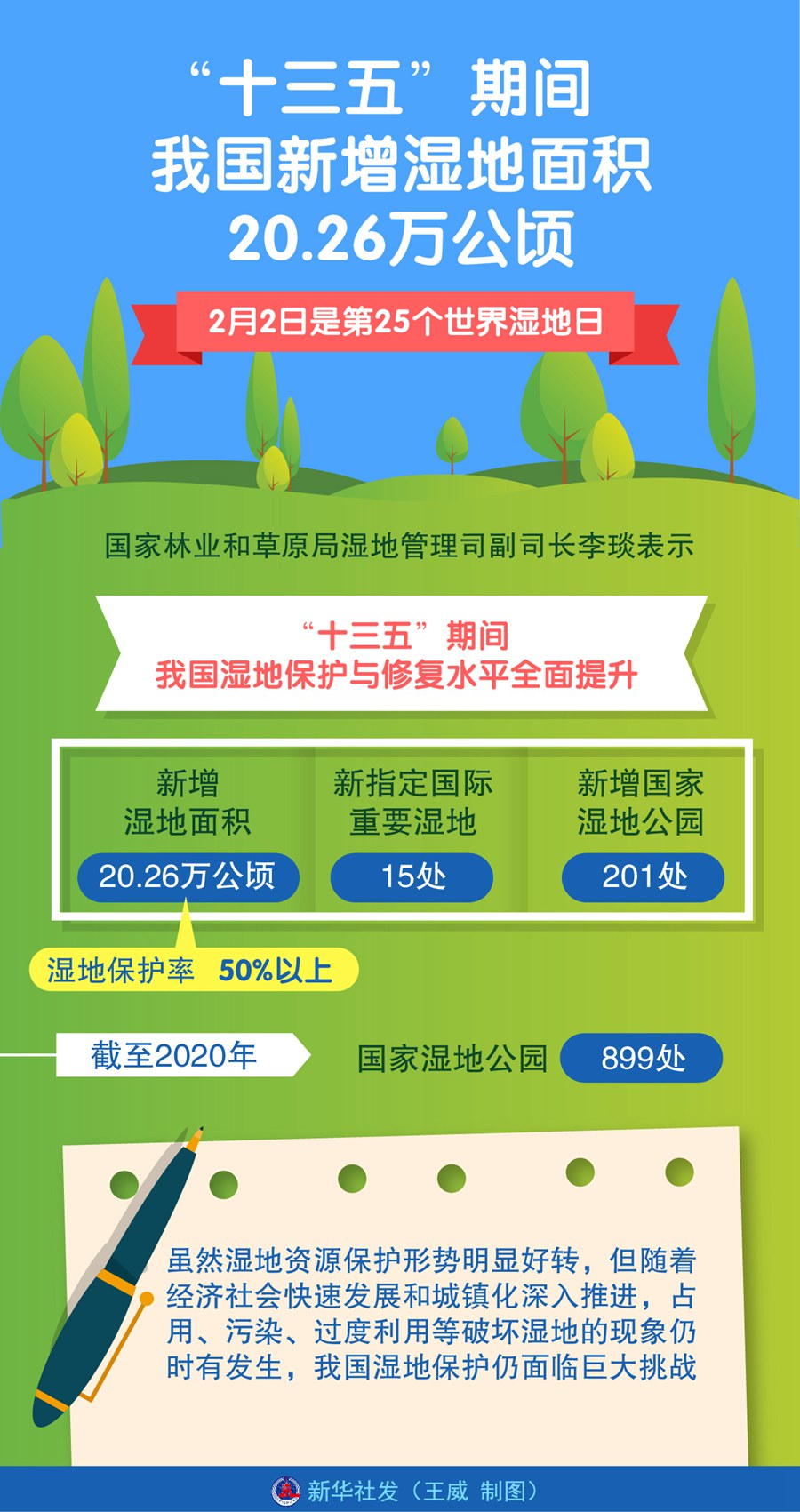 新华社北京2月2日电(记者胡璐)2日是第25个世界湿地日。国家林业和草原局湿地管理司副司长李琰2日表示,“十三五”期间,我国湿地保护与修复水平全面提升,新增湿地面积20.26万公顷,湿地保护率达到50%以上。