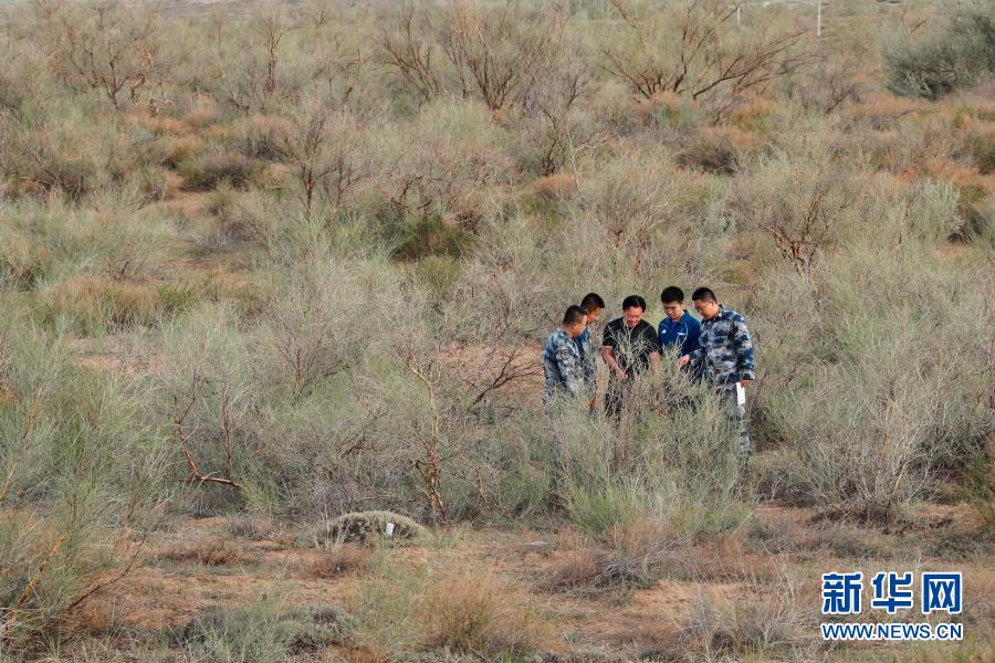 空军某运输搜救团一大队官兵和地方林业人员在内蒙古阿拉善左旗“1992年播区”察看植物生长情况(2020年6月8日摄)。新华社发(刘畅 摄)