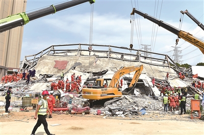 2020年3月7日晚,福建省泉州市鲤城区一家用于疫情防控集中隔离的酒店发生坍塌事故。事后调查显示,相关职能部门工作人员存在严重失职失责问题。最终,49名公职人员被严肃追责问责,其中7人被移送司法机关追究刑责。图为坍塌事故搜救现场。 新华社记者 林善传 摄