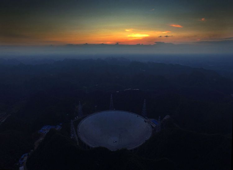 朝阳中的“中国天眼”。(中科院国家天文台提供)