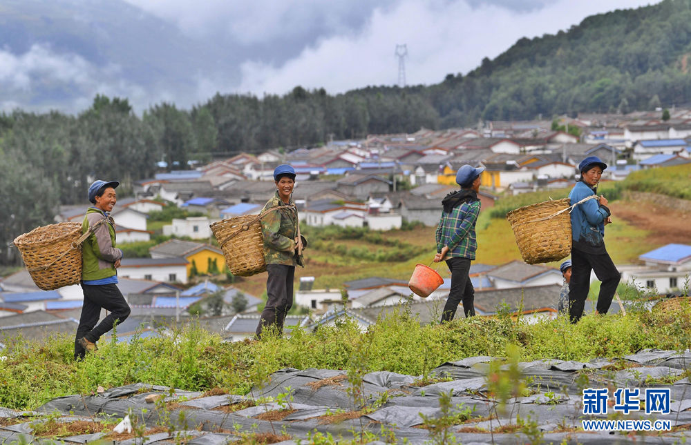 2020年8月13日,四川省凉山彝族自治州布拖县拖觉镇老吉村的妇女在去往蓝莓种植基地务工的路上。新华社记者 刘坤 摄
