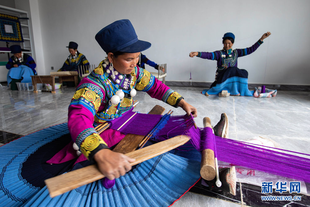 2020年9月14日,在四川省凉山彝族自治州布拖县易地扶贫搬迁县城集中安置点(依撒社区)彝绣扶贫车间,几名留守彝族妇女在制作彝族传统服饰。新华社记者 江宏景 摄
