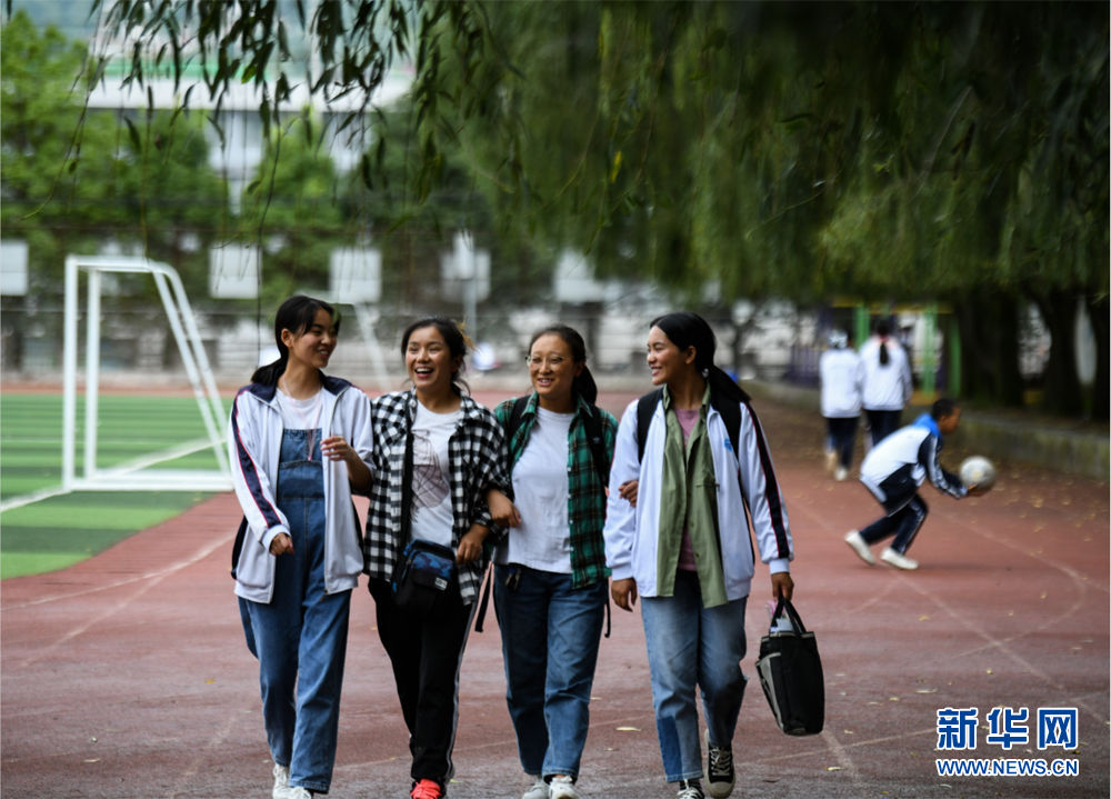 2020年9月6日,越西县西城中学,莫色小兰(左二)和学生在操场上散步。新华社记者 王曦 摄