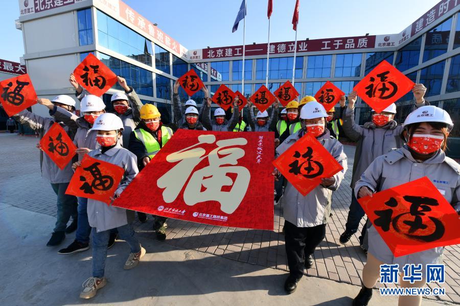 2月3日,北京建工路桥集团留京过年的技术员和工人们展示他们收到的“福”字。